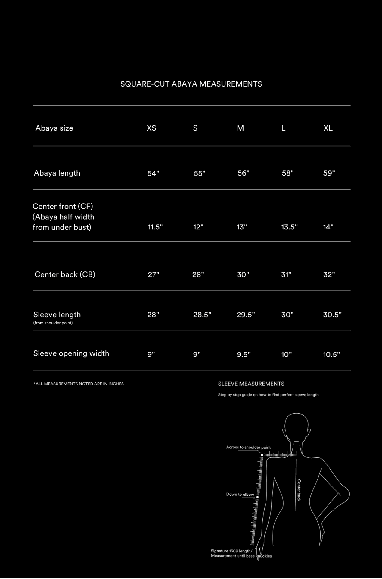 In this abaya size guide, you will find precise dimensions in inches that apply to the ego© abaya designs.